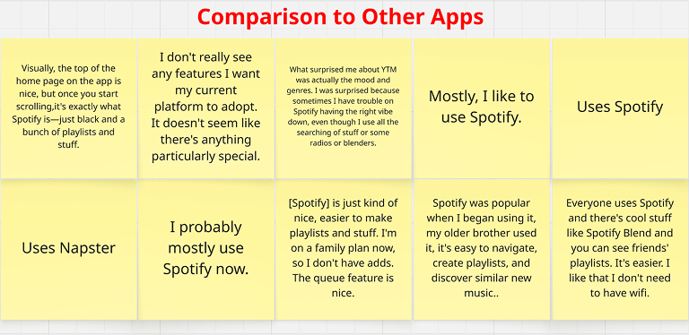 This theme includes quotes that compare YTM to other apps or what other apps participants use, and why. Most participants use Spotify.