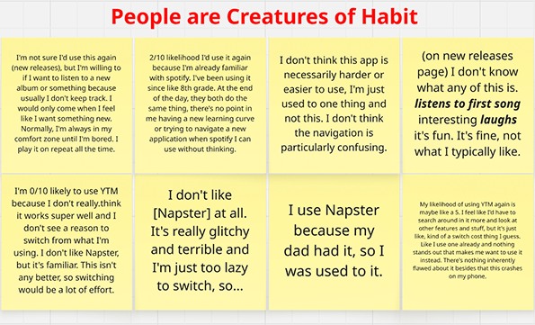 This theme includes quotes that highlight how our participants strongly prefer to continue using the same app and listening to the same kinds of music.