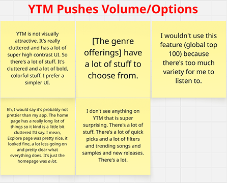 During post-task interviews, the average rating from 1-10 of likelihood to use YTM was a 3. Among the reasons given for not using it, participants included the difficulty of recreating their Spotify preferences in YTM, a lack of compelling features, and comfort with their current platform. When asked if there were any surprising features about the app, half of the users mentioned the My Music Tuner feature. However, this may have been the result of recency bias, as it was the last feature they were asked to use before the post-task interview. When asked, users didn't have substantial complaints about overall usability. No users found YTM easier to navigate than their current platform. Only one user stated there was a feature on YTM they would like to see adopted by their platform of choice, and that was YTM's Moods And Moments feature because of it's expressive use of color. In terms of overall attractiveness, most users enjoyed the use of color at the top of the home page and one enjoyed the use of color on Moods and Moments. However, users generally found the layout to be too high-contrast and cluttered. Finally, when asked about the quality of recommendations, users found YTM's music recommendations to be mostly aligned with users' interests.